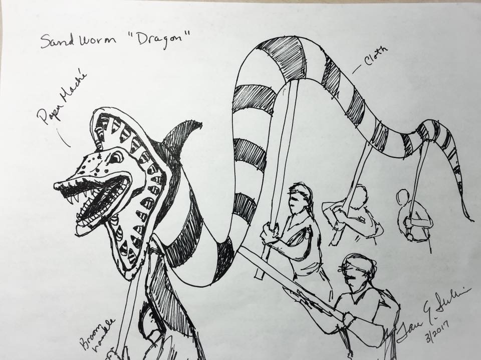The first thing needed is an inspirational idea (Thank you Tara Sullivan). Next, engineer the Worm for a specific operation (mechanically and structurally) and choose the materials (assessing strength, weight and cost). Additional considerations in the Sandworm's design include fixturing (for ease in working on it ) and sizing so it can be moved outside the building. It will need to be transported to the Parade in various pieces (make sure the rental truck has tall enough doors!) and reassembled on site.