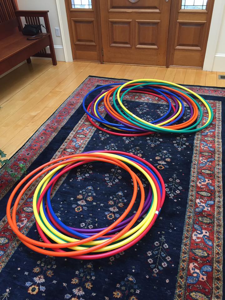Cut aluminum mop handles 6" longer than the hoop diameters. Insert Cotter pins 4" from one end (bottom). Affix "handles" with electrical tape vertically on the center of the hoops, every other color segment, allow the 6"extra tubing to extend from the hoop bottom. These tubes allow separate handling rods to be inserted on-site for the purposes of carrying the Sandworm body by the Wranglers.